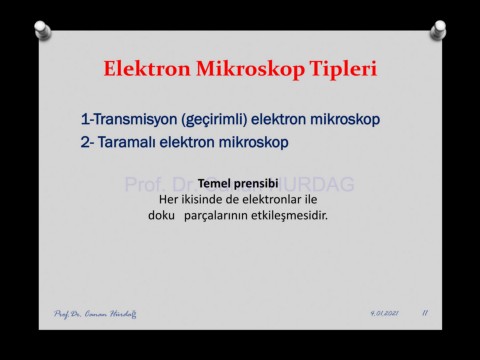 Elektron Mikroskop Tipleri 1-Transmisyon (geçirimli) elektron mikroskop 2- Taramalı elektron mikroskop Prof. Dr. Canan HURDAG Temel prensibi Her ikisinde de elektronlar ile doku parçalarının etkileşmesidir. Prof.Dr. Canan Hürdağ 4.01.2021 11