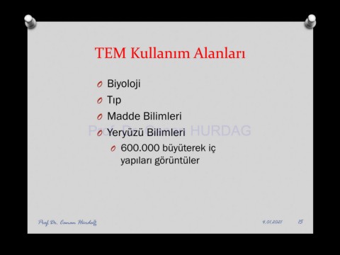 TEM Kullanım Alanları O Biyoloji O Tıp O Madde Bilimleri Prof. Dr. Canan HURDAG O Yeryüzü Bilimleri O 600.000 büyüterek iç yapıları görüntüler Prof.Dr. Canan Hürdağ 4.01.2021 15