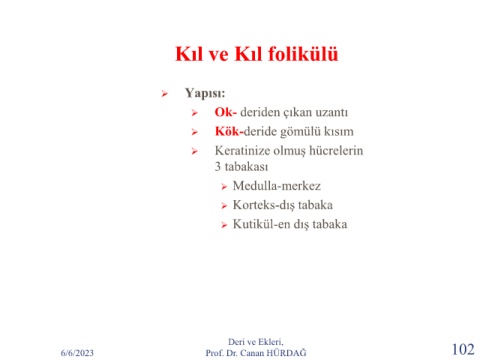 Kıl ve Kıl folikülü ➢ Yapısı: ➢ Ok- deriden çıkan uzantı ➢ Kök-deride gömülü kısım ➢ Keratinize olmuş hücrelerin 3 tabakası ➢ Medulla-merkez ➢ Korteks-dış tabaka ➢ Kutikül-en dış tabaka Deri ve Ekleri, 6/6/2023 Prof. Dr. Canan HÜRDAĞ 102