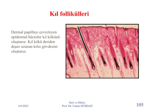 Kıl follikülleri Dermal papillayı çevreleyen epidermal hücreler kıl kökünü oluşturur. Kıl kökü deriden dışarı uzanan kılın gövdesini oluşturur. Deri ve Ekleri, 6/6/2023 Prof. Dr. Canan HÜRDAĞ 105