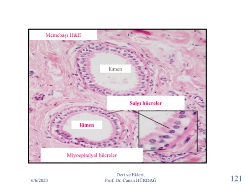 Memebaşı H&E lümen Salgı hücreler lümen Miyoepitelyal hücreler Deri ve Ekleri, 6/6/2023 Prof. Dr. Canan HÜRDAĞ 121