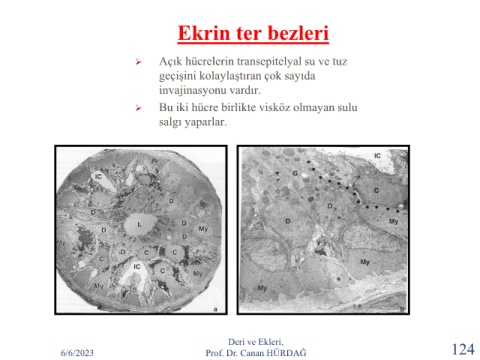 Ekrin ter bezleri ➢ Açık hücrelerin transepitelyal su ve tuz geçişini kolaylaştıran çok sayıda invajinasyonu vardır. ➢ Bu iki hücre birlikte visköz olmayan sulu salgı yaparlar. Deri ve Ekleri, 6/6/2023 Prof. Dr. Canan HÜRDAĞ 124
