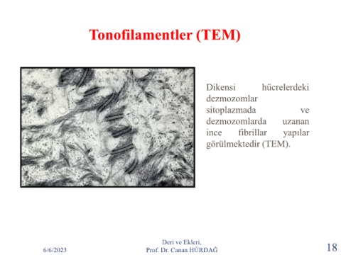 Tonofilamentler (TEM) Dikensi hücrelerdeki dezmozomlar sitoplazmada ve dezmozomlarda uzanan ince fibrillar yapılar görülmektedir (TEM). Deri ve Ekleri, 6/6/2023 Prof. Dr. Canan HÜRDAĞ 18