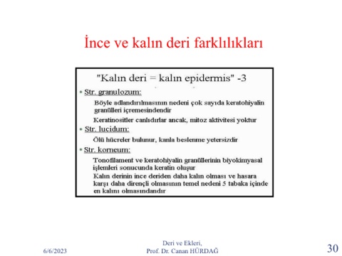 İnce ve kalın deri farklılıkları Deri ve Ekleri, 6/6/2023 Prof. Dr. Canan HÜRDAĞ 30