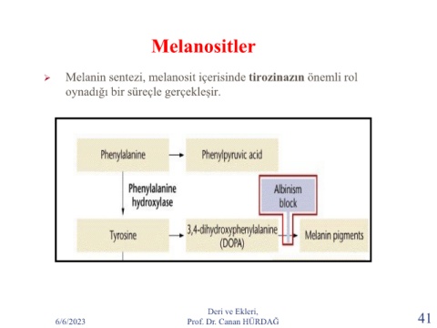Melanositler ➢ Melanin sentezi, melanosit içerisinde tirozinazın önemli rol oynadığı bir süreçle gerçekleşir. Deri ve Ekleri, 6/6/2023 Prof. Dr. Canan HÜRDAĞ 41