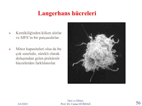 Langerhans hücreleri ➢ Kemikiliğinden köken alırlar ve MFS’in bir parçasıdırlar. ➢ Mitoz kapasiteleri olsa da bu çok sınırlıdır, sürekli olarak dolaşımdan gelen prekürsör hücrelerden farklılanırlar. Deri ve Ekleri, 6/6/2023 Prof. Dr. Canan HÜRDAĞ 56