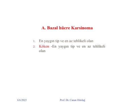 A. Bazal hücre Karsinoma 1. En yaygın tip ve en az tehlikeli olan 2. Köken -En yaygın tip ve en az tehlikeli olan 6/6/2023 Prof. Dr. Canan Hürdağ