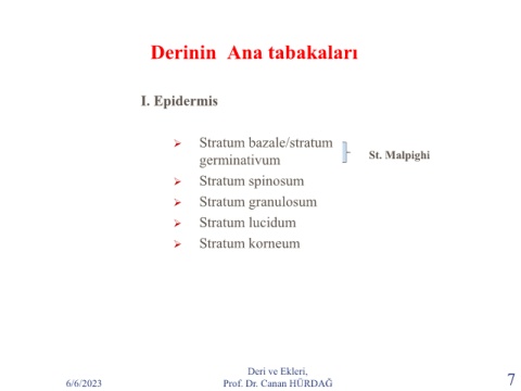 Derinin Ana tabakaları I. Epidermis ➢ Stratum bazale/stratum germinativum St. Malpighi ➢ Stratum spinosum ➢ Stratum granulosum ➢ Stratum lucidum ➢ Stratum korneum Deri ve Ekleri, 6/6/2023 Prof. Dr. Canan HÜRDAĞ 7