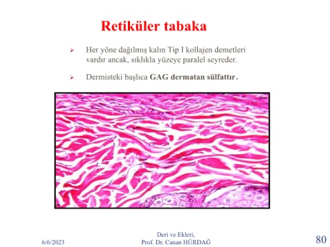 Retiküler tabaka ➢ Her yöne dağılmış kalın Tip I kollajen demetleri vardır ancak, sıklıkla yüzeye paralel seyreder. Dermisteki başlıca GAG dermatan sülfattır. ➢ Deri ve Ekleri, 6/6/2023 Prof. Dr. Canan HÜRDAĞ 80
