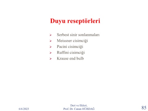 Duyu reseptörleri ➢ Serbest sinir sonlanmaları ➢ Meissner cisimciği ➢ Pacini cisimciği ➢ Ruffini cisimciği ➢ Krause end bulb Deri ve Ekleri, 6/6/2023 Prof. Dr. Canan HÜRDAĞ 85