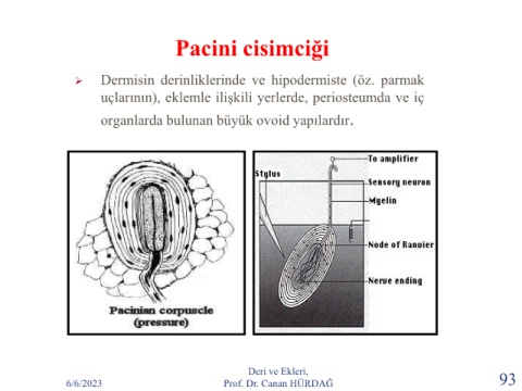 Pacini cisimciği ➢ Dermisin derinliklerinde ve hipodermiste (öz. parmak uçlarının), eklemle ilişkili yerlerde, periosteumda ve iç organlarda bulunan büyük ovoid yapılardır. Deri ve Ekleri, 6/6/2023 Prof. Dr. Canan HÜRDAĞ 93