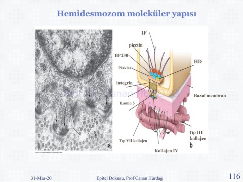Hemidesmozom moleküler yapısı IF plectin BP230 HD Plaklar integrin Prof. Dr. Canan HURDAG Bazal membran Lamin 5 Tip III kollajen Tıp VII kollajen Kollajen IV 116 31-Mar-20 Epitel Dokusu, Prof Canan Hürdağ