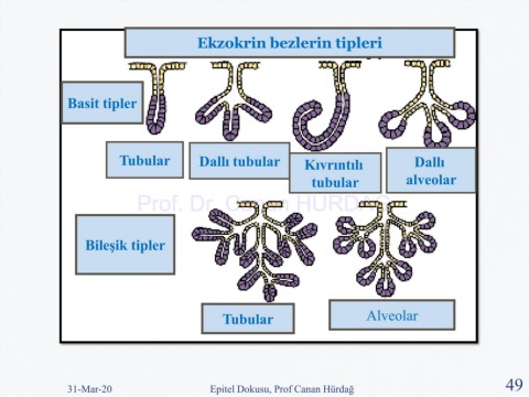 Ekzokrin bezlerin tipleri Basit tipler Tubular Dallı tubular Kıvrıntılı Dallı tubular alveolar Prof. Dr. Canan HURDAG Bileşik tipler Tubular Alveolar 49 31-Mar-20 Epitel Dokusu, Prof Canan Hürdağ