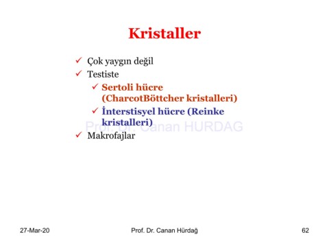 Kristaller ✓ Çok yaygın değil ✓ Testiste ✓ Sertoli hücre (CharcotBöttcher kristalleri) ✓ İnterstisyel hücre (Reinke kristalleri) Prof. Dr. Canan HURDAG ✓ Makrofajlar 27-Mar-20 Prof. Dr. Canan Hürdağ 62