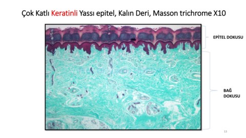 Çok Katlı Keratinli Yassı epitel, Kalın Deri, Masson trichrome X10 EPİTEL DOKUSU Prof. Dr. Canan HURDAG BAĞ DOKUSU 13