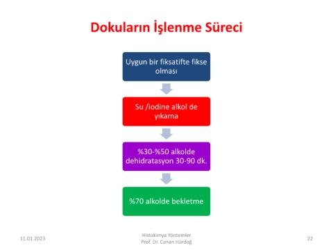 Dokuların İşlenme Süreci Uygun bir fiksatifte fikse olması Su /iodine alkol de yıkama %30-%50 alkolde dehidratasyon 30-90 dk. %70 alkolde bekletme Histokimya Yöntemler 11.01.2023 22 Prof. Dr. Canan Hürdağ