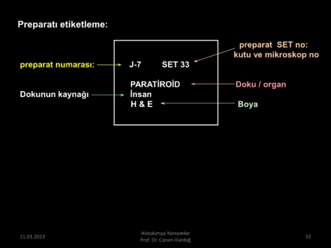 Preparatı etiketleme: preparat SET no: kutu ve mikroskop no preparat numarası: J-7 SET 33 PARATİROİD Doku / organ Dokunun kaynağı İnsan H & E Boya Histokimya Yöntemler 11.01.2023 32 Prof. Dr. Canan Hürdağ