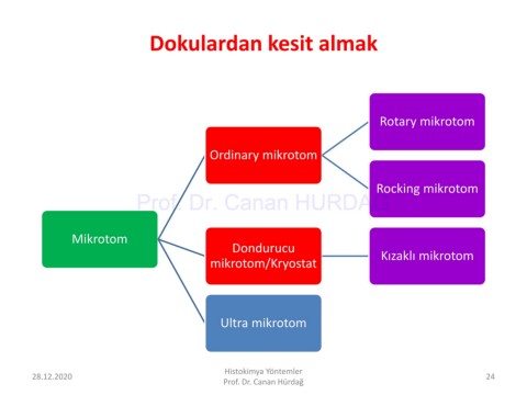 Dokulardan kesit almak Rotary mikrotom Ordinary mikrotom Rocking mikrotom Prof. Dr. Canan HURDAG Mikrotom Dondurucu mikrotom/Kryostat Kızaklı mikrotom Ultra mikrotom Histokimya Yöntemler 28.12.2020 24 Prof. Dr. Canan Hürdağ