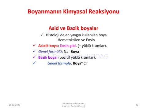 ✓ Asidik boya: Eosin gibi. (– yüklü kısımlar).