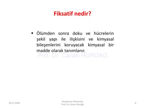 Fiksatif nedir? ▪ Ölümden sonra doku ve hücrelerin şekil yapı ile ilişkisini ve kimyasal bileşenlerini koruyacak kimyasal bir madde olarak tanımlanır. Prof. Dr. Canan HURDAG Histokimya Yöntemler 28.12.2020 6 Prof. Dr. Canan Hürdağ