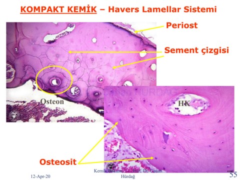 KOMPAKT KEMİK – Havers Lamellar Sistemi Periost Sement çizgisi Prof. Dr. Canan HURDAG Osteon HK Osteosit Kemik Dokusu, Prof. Dr. Canan 12-Apr-20 Hürdağ 55