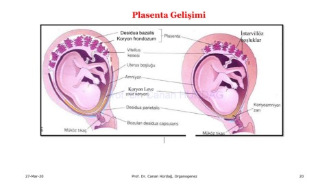 Plasenta Gelişimi Desidua bazalis İntervillöz Koryon frondozum boşluklar Koryon Leve Prof. Dr. Canan HURDAG 5.Hafta 22.Hafta 27-Mar-20 Prof. Dr. Canan Hürdağ, Organogenez 20
