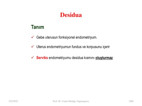 Desidua Tanım ✓ Gebe uterusun fonksiyonel endometriyum. ✓ Uterus endometriyumun fundus ve korpusunu içerir ✓ Serviks endometriyumu desidua kısmını oluşturmaz 3/22/2022 Prof. Dr. Canan Hürdağ, Organogenez 102