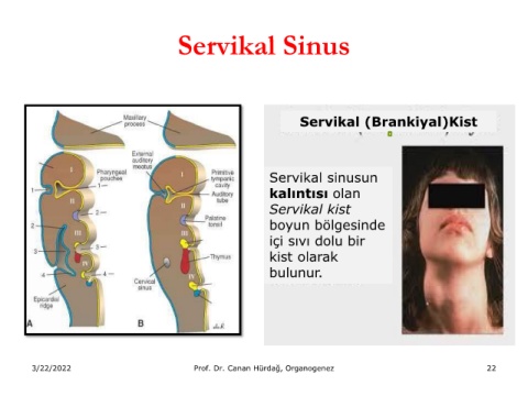 Servikal Sinus Servikal (Brankiyal)Kist Servikal sinusun kalıntısı olan Servikal kist boyun bölgesinde içi sıvı dolu bir kist olarak bulunur. 3/22/2022 Prof. Dr. Canan Hürdağ, Organogenez 22