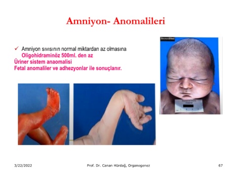 Amniyon- Anomalileri ✓ Amniyon sıvısının normal miktardan az olmasına Oligohidraminöz 500ml. den az Üriner sistem anaomalisi Fetal anomaliler ve adhezyonlar ile sonuçlanır. 3/22/2022 Prof. Dr. Canan Hürdağ, Organogenez 67