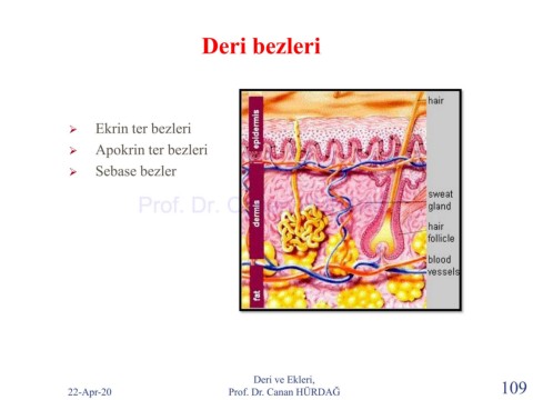 Deri bezleri ➢ Ekrin ter bezleri ➢ Apokrin ter bezleri ➢ Sebase bezler Prof. Dr. Canan HURDAG Deri ve Ekleri, 22-Apr-20 Prof. Dr. Canan HÜRDAĞ 109