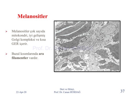 Melanositler ➢ Melanositler çok sayıda mitokondri, iyi gelişmiş Golgi kompleksi ve kısa GER içerir. Prof. Dr. Canan HURDAG ➢ Bazal kısımlarında ara filamentler vardır. Deri ve Ekleri, 22-Apr-20 Prof. Dr. Canan HÜRDAĞ 37