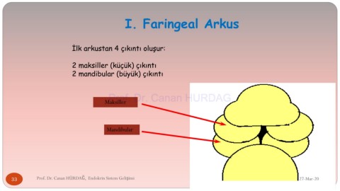 I. Faringeal Arkus İlk arkustan 4 çıkıntı oluşur: 2 maksiller (küçük) çıkıntı 2 mandibular (büyük) çıkıntı Prof. Dr. Canan HURDAG Maksiller Mandibular 33 Prof. Dr. Canan HÜRDAĞ, Endokrin Sistem Gelişimi 27-Mar-20