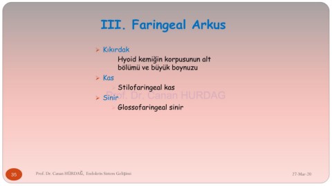 III. Faringeal Arkus ➢ Kıkırdak ➢ Hyoid kemiğin korpusunun alt bölümü ve büyük boynuzu ➢ Kas ➢ Stilofaringeal kas Prof. Dr. Canan HURDAG ➢ Sinir ➢ Glossofaringeal sinir 35 Prof. Dr. Canan HÜRDAĞ, Endokrin Sistem Gelişimi 27-Mar-20