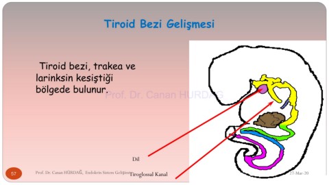 Tiroid Bezi Gelişmesi Tiroid bezi, trakea ve larinksin kesiştiği bölgede bulunur. Prof. Dr. Canan HURDAG Dil 57 Prof. Dr. Canan HÜRDAĞ, Endokrin Sistem Gelişimi Tiroglossal Kanal 27-Mar-20