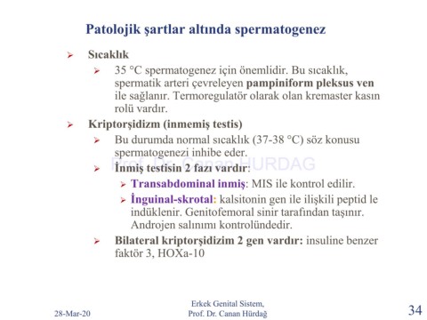 ➢ 35 °C spermatogenez için önemlidir. Bu sıcaklık,