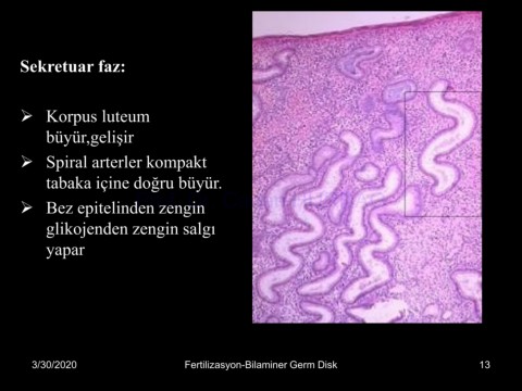 Sekretuar faz: ➢ Korpus luteum büyür,gelişir ➢ Spiral arterler kompakt tabaka içine doğru büyür. Prof. Dr. Canan HURDAG ➢ Bez epitelinden zengin glikojenden zengin salgı yapar 3/30/2020 Fertilizasyon-Bilaminer Germ Disk 13