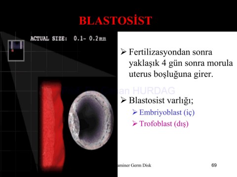 BLASTOSİST ➢ Fertilizasyondan sonra yaklaşık 4 gün sonra morula uterus boşluğuna girer. Prof. Dr. Canan HURDAG ➢ Blastosist varlığı; ➢Embriyoblast (iç) ➢Trofoblast (dış) 3/30/2020 Fertilizasyon-Bilaminer Germ Disk 69
