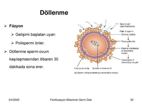 Döllenme ➢ Füzyon ➢ Gelişimi başlatan uyarı ➢ Polispermi önler. ➢ Döllenme sperm-ovum kaşılaşmasından itibaren 30 dakikada sona erer. 3/4/2025 Fertilizasyon-Bilaminer Germ Disk 33