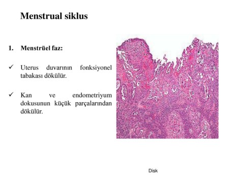 Menstrual siklus 1. Menstrüel faz: ✓ Uterus duvarının fonksiyonel tabakası dökülür. ✓ Kan ve endometriyum dokusunun küçük parçalarından dökülür. 3/4/2025 Fertilizasyon-Bilaminer Germ Disk 8