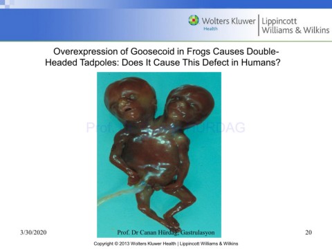 Overexpression of Goosecoid in Frogs Causes Double- Headed Tadpoles: Does It Cause This Defect in Humans? Prof. Dr. Canan HURDAG 3/30/2020 Prof. Dr Canan Hürdağ, Gastrulasyon 20 Copyright © 2013 Wolters Kluwer Health | Lippincott Williams & Wilkins