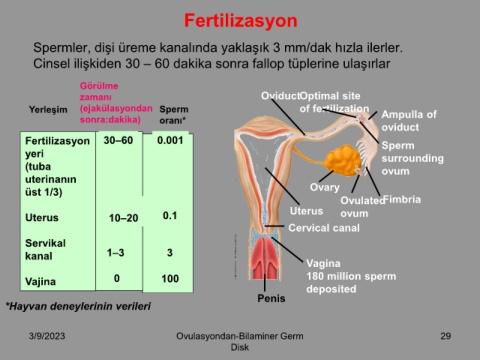 Spermler, dişi üreme kanalında yaklaşık 3 mm/dak hızla ilerler.