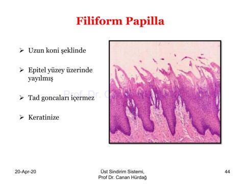 Filiform Papilla ➢ Uzun koni şeklinde ➢ Epitel yüzey üzerinde yayılmış Prof. Dr. Canan HURDAG ➢ Tad goncaları içermez ➢ Keratinize 20-Apr-20 Üst Sindirim Sistemi, 44 Prof Dr. Canan Hürdağ