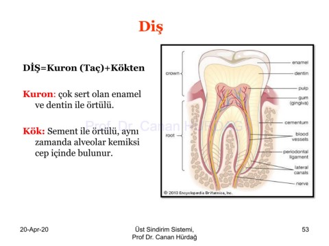 Diş DİŞ=Kuron (Taç)+Kökten Kuron: çok sert olan enamel ve dentin ile örtülü. Prof. Dr. Canan HURDAG Kök: Sement ile örtülü, aynı zamanda alveolar kemiksi cep içinde bulunur. 20-Apr-20 Üst Sindirim Sistemi, 53 Prof Dr. Canan Hürdağ