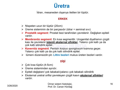 Prostatik segment: Prostat bezi tarafından çevrelenir. Değişken epiteli