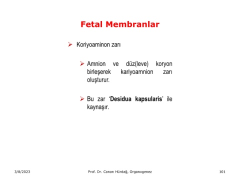 Fetal Membranlar ➢ Koriyoaminon zarı ➢ Amnion ve düz(leve) koryon birleşerek kariyoamnion zarı oluşturur. ➢ Bu zar ‘Desidua kapsularis’ ile kaynaşır. 3/8/2023 Prof. Dr. Canan Hürdağ, Organogenez 101