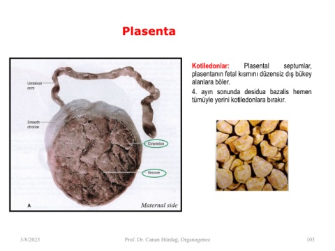 Plasenta Kotiledonlar: Plasental septumlar, plasentanın fetal kısmını düzensiz dış bükey alanlara böler. 4. ayın sonunda desidua bazalis hemen tümüyle yerini kotiledonlara bırakır. Maternal side 3/8/2023 Prof. Dr. Canan Hürdağ, Organogenez 103