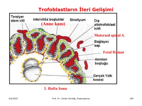 Trofoblastların İleri Gelişimi (Anne kanı) Maternal spiral A. Fetal Damar . . . 3. Hafta Sonu 3/8/2023 Prof. Dr. Canan Hürdağ, Organogenez 106