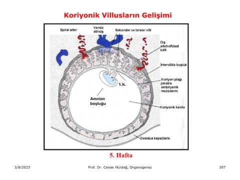 Koriyonik Villusların Gelişimi Y.K. Amnion boşluğu 5. Hafta 3/8/2023 Prof. Dr. Canan Hürdağ, Organogenez 107