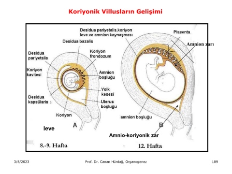 Koriyonik Villusların Gelişimi Amnion zarı leve Amnio-koriyonik zar 3/8/2023 Prof. Dr. Canan Hürdağ, Organogenez 109