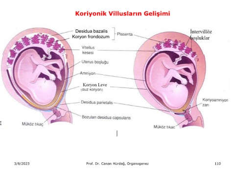 Koriyonik Villusların Gelişimi Desidua bazalis İntervillöz Koryon frondozum boşluklar Koryon Leve 5.Hafta 22.Hafta 3/8/2023 Prof. Dr. Canan Hürdağ, Organogenez 110